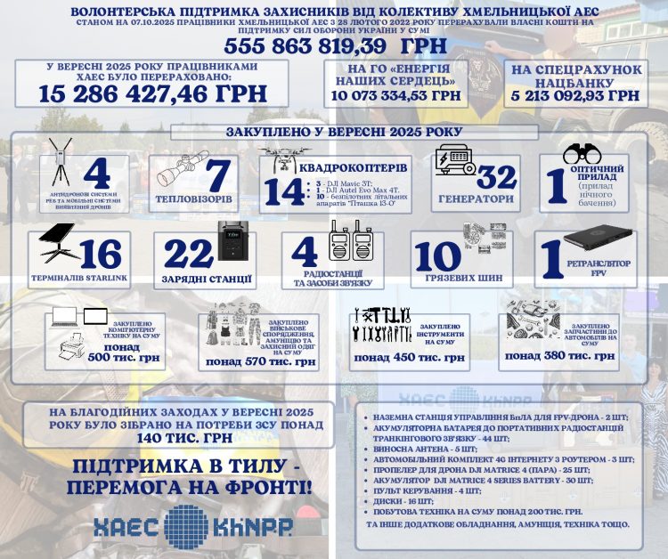 Станом на 7 жовтня 2025 року працівники Хмельницької АЕС перерахували на потреби оборони України понад 555,8 млн грн.