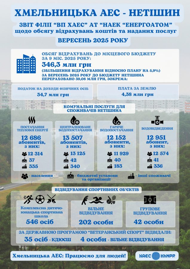 За дев’ять місяців 2025 року Хмельницька атомна електростанція перерахувала до бюджету Нетішинської громади 346,3 мільйона гривень, із них понад 39 мільйонів — у вересні.