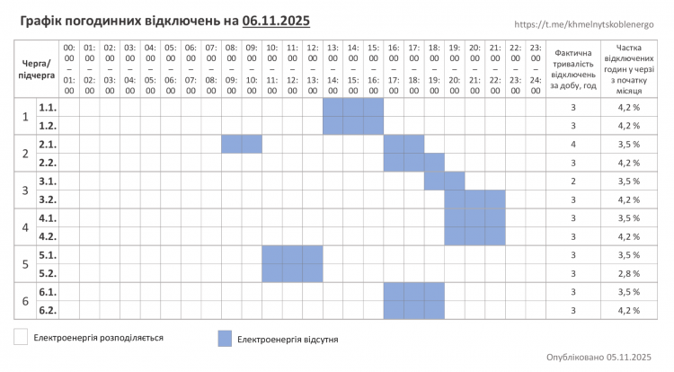 За розпорядженням НЕК «Укренерго» 6 листопада 2025 року на Хмельниччині знову діятиме графік погодинних відключень (ГПВ).