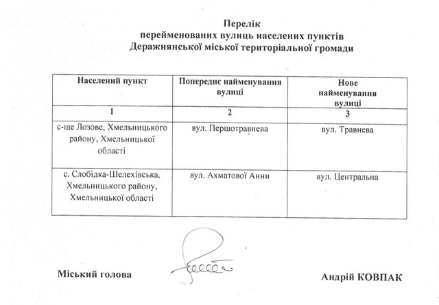 У Деражнянській громаді Хмельницької області в межах процесу декомунізації перейменували вулиці у двох населених пунктах — селах Лозове та Слобідка-Шелехівська.