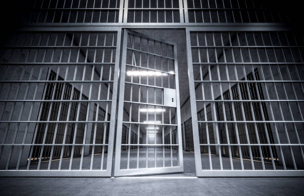 corridor of a prison with bars and open cell door. 3d render. concept of retention, crisis, loneliness, consequences. Crime.