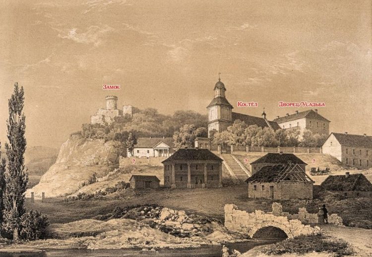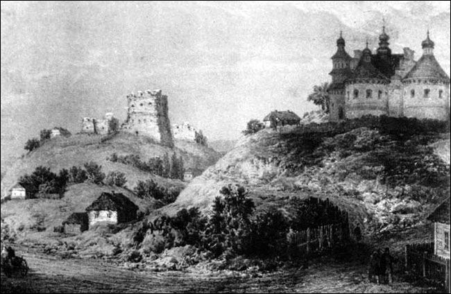 Сутківці, малюнок Наполеона Орди, на задньому тлі — замок, на передньому Покровська церква