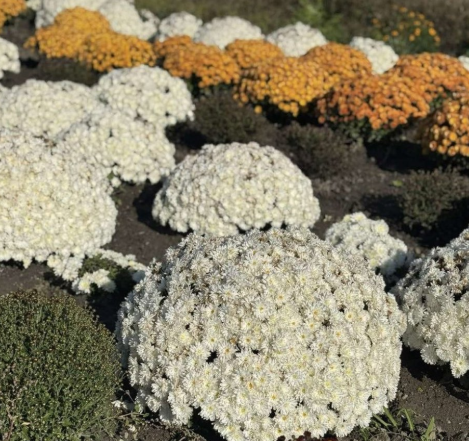 Серед її хризантем найбільше білих — саме вони зацвітають найпершими. Є й улюблені сорти, які вона називає «ґудзички» — невеликі, щільні квіти, що зберігають декоративність навіть після перших заморозків.