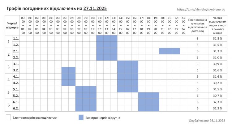 За розпорядженням НЕК «Укренерго» 27 листопада на Хмельниччині діятиме графік погодинних відключень.