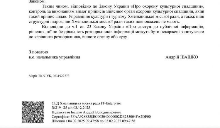 Керівництво міста й області фактично ігнорує знищення культурної спадщини у Хмельницькому. Такий висновок зробив член Національної спілки архітекторів України Сергій Козак, проаналізувавши відповіді посадовців на свої інформаційні запити.