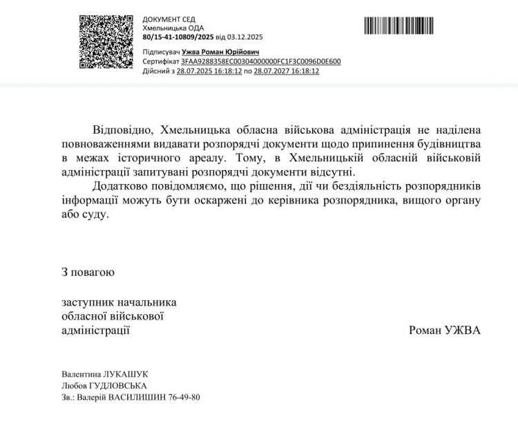 Міністерство звернулося до Хмельницької обласної державної адміністрації та Хмельницької міської ради з вимогою сприяти наведенню порядку. Однак, як зазначає архітектор, будівельні роботи досі не припинені, а контролюючі органи фактично уникають перевірок проблемних майданчиків.