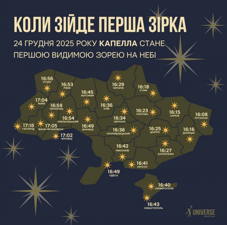 Через різницю в географічному положенні та часі заходу Сонця, першою різдвяну зорю зможуть побачити мешканці східних та північно-східних областей України. У західних регіонах вона з’явиться трохи пізніше.