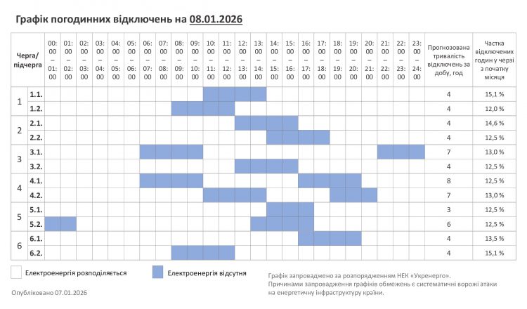 У четвер, 8 січня, на Хмельниччині діятиме графік погодинних відключень. В обленерго наголошують, що енергосистема динамічна, на її стан впливає багато факторів, в тому числі і погодні умови. У разі отримання нових розпоряджень від оператора системи передачі, обсяг обмежень може змінитися.