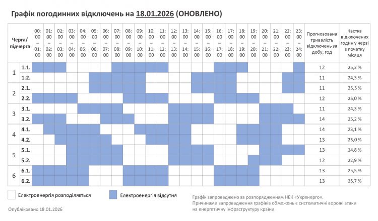 Сьогодні, 18 січня, на Хмельниччині оновили графік погодинних відключень. В обленерго наголошують, що енергосистема динамічна, на її стан впливає багато факторів, в тому числі і погодні умови. У разі зміни ситуації та отримання нових розпоряджень від оператора системи передачі, обсяг обмежень може змінитися.