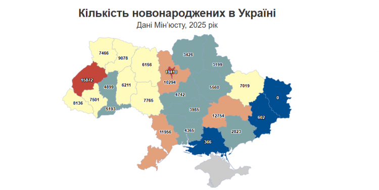 Найбільше дітей традиційно народилось у Києві — 19 410 новонароджених або 11,5% від загальної кількості. При цьому столиця втратила лише 1,5% порівняно з 2024 роком. На другому місці Львівщина — 15 872 немовляти, а на третьому — Дніпропетровщина: 12 754 дитини.