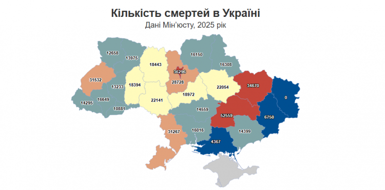 Найбільше смертей зафіксовано на Дніпропетровщині (52 559), у Києві (36 296) та на Харківщині (34 670).