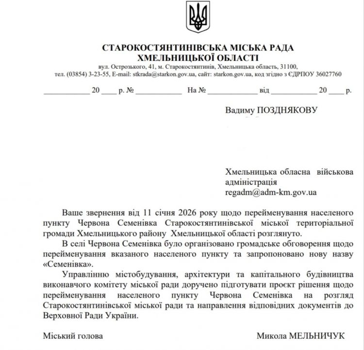 У Старокостянтинівській міській раді повідомили про намір перейменувати ще одне село в межах декомунізації. Відповідне рішення підтримали місцеві жителі під час громадських обговорень.