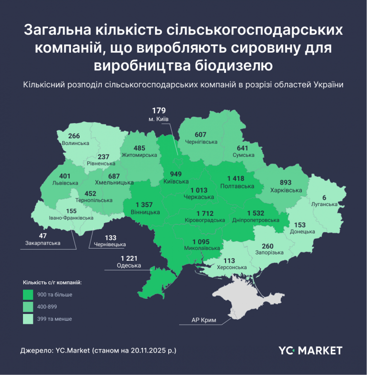 За даними аналітичної платформи YC.Market, станом на кінець 2025 року в Україні працює понад 16 тисяч аграрних компаній, які потенційно можуть постачати сировину для виробництва біодизелю. Йдеться про підприємства, що вирощують зернові, бобові та олійні культури, мають активний статус і річну виручку понад 1 млн грн.