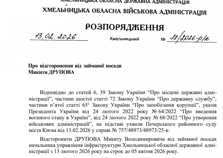 Голова Хмельницької обласної військової адміністрації Сергій Тюрін відсторонив від посади начальника управління інфраструктури Микиту Друпова. Відповідне рішення діятиме з 13 лютого до 5 квітня 2026 року.