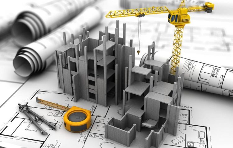 abstract 3d illustration of construction over blueprints